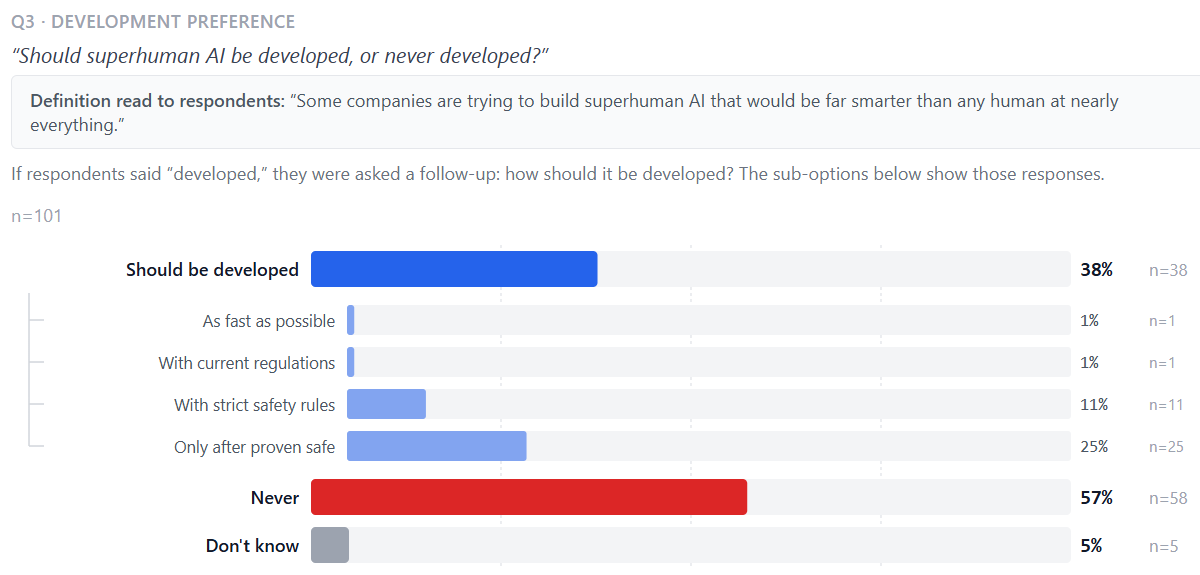 This question was the longest and most complex question. I basically have to give all of the options since it's not on a simple scale. I decided to first split it on whether someone thinks superhuman AI should be developed at all, and then only give the more granular options if they do think it should be developed. This difference in methodology could explain the difference between my results and FLI results, but it seems unlikely because even still the vast majority of respondents who thought it should be developed still thought it should be developed with serious regulation. It’s possible the initial framing of should or should not be developed biased the responses for the subsets of “Should be developed”. Overall these results are extremely strong though. Of the 96 people who answered with an opinion, only 2 of them thought it should be with current regulations or as fast as possible.