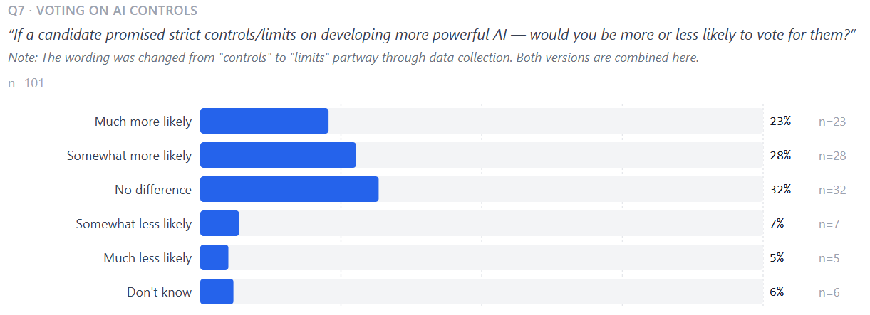 This question was terrible for a couple reasons. First people were frequently confused the “limits on developing more powerful AI” clause is just brutal. This was frequently misunderstood and my model is basically people just remember the most recent thing, so they simply remembered “more powerful AI” and discarded the limits part. People would be like yeah I am super worried about AI I hate it I never use it and then answer “much less likely”. I eventually ended up repeating “limits on developing more powerful AI” two times to try to help, but I think this was a good lesson on you want the absolute simplest question construction possible. There is just huge variance in reading comprehension and limiting that as a confounding factor is really important. Similarly, I started with “controls on developing more powerful AI” and I had at least 1 person interpret that as the politicians getting control over the AIs themselves. I tried to be quite careful with my wording, and this is part of why I made the simplest explanation of superhuman AI I could think of for question 3, but even still the takeaway here is when designing surveys you want basically no words that alter meaning, especially if they are farther away in the sentence. This question was also interesting in that it also got confounded by just general anti-politician sentiment. Some people answered less likely on the grounds that you simply can’t trust politicians at all. I think likely if I were to do this again I would simplify and ask if they would support a law instead of support a politician3. There has been very little published surveying on the salience of AI risk to electability, so I am still happy I included this question.